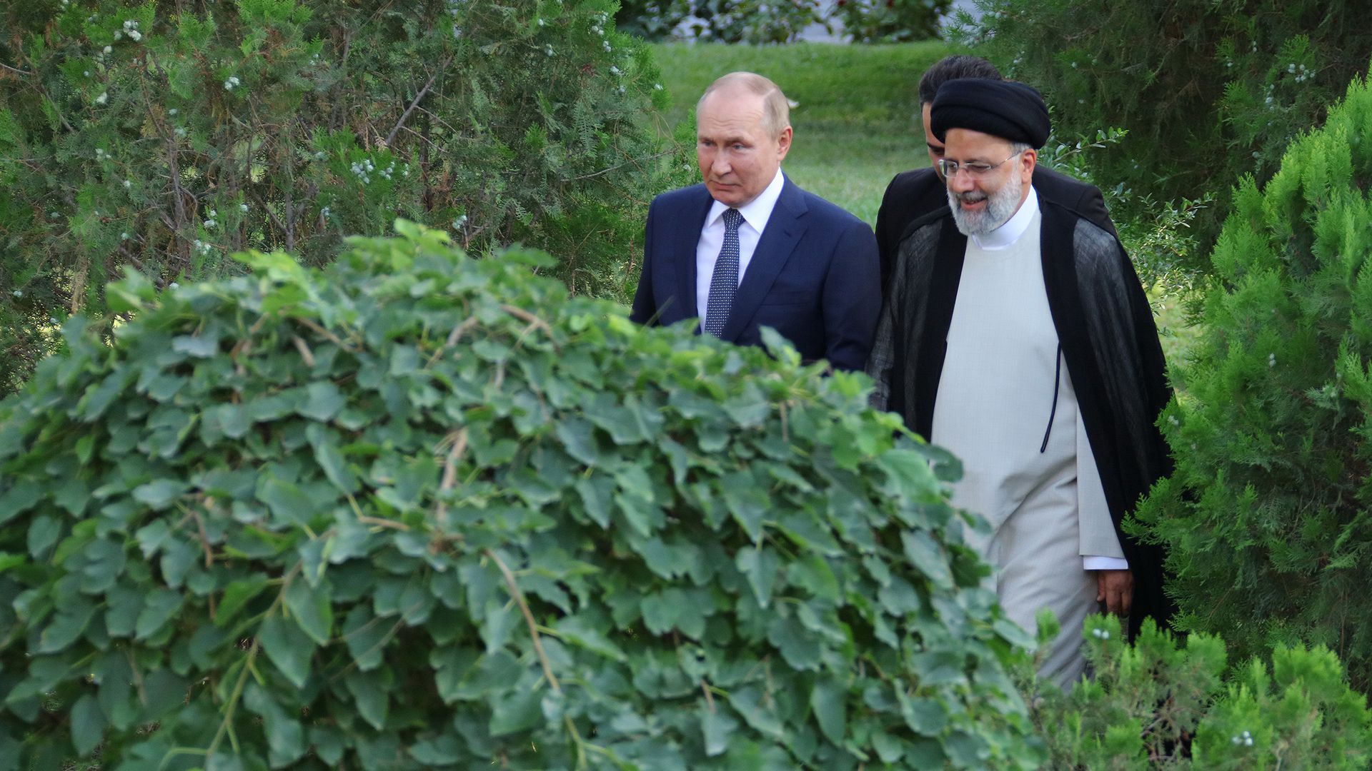 Russian President Vladimir Putin and Iranian President Ebrahim Raisi stroll in the garden in Tehran. Photo: Iranian Presidency Handout via Getty