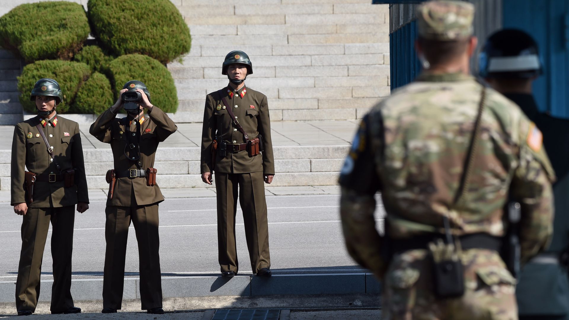 North Korean soldiers look across the border between North and South Korea. Photo: Jung Yeon-Je/AFP via Getty Images