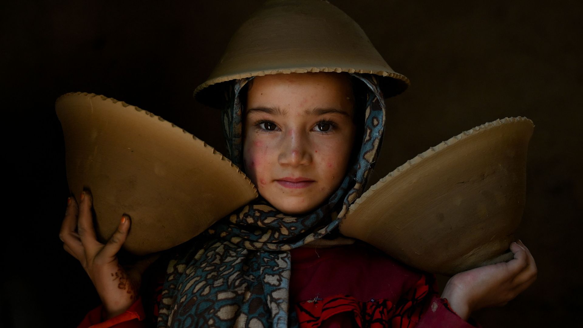An Afghan child carries clay pots at a traditionally run factory in Kabul province. Photo: Wakil Kohsar/AFP via Getty Images