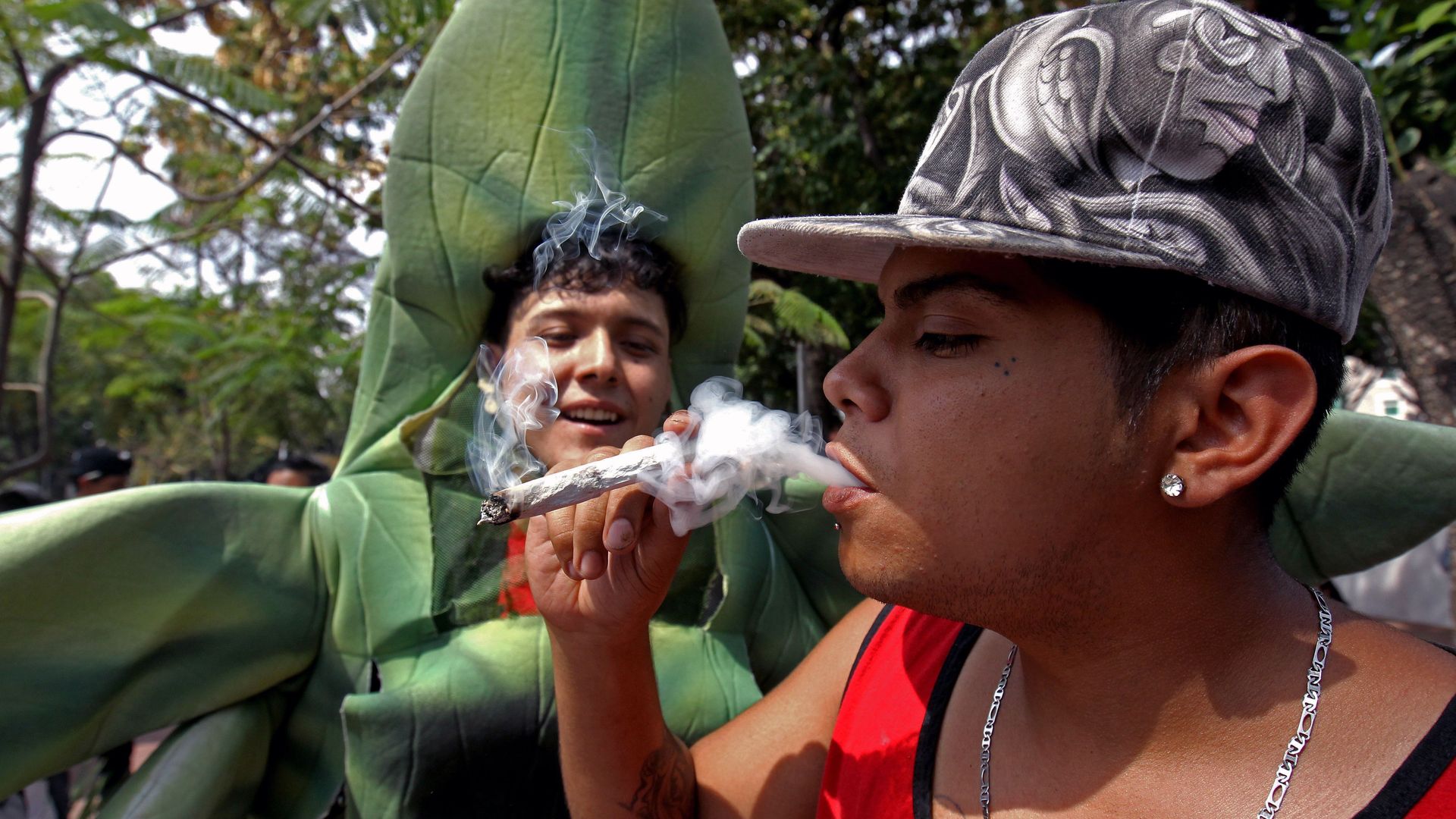Two men at a pro-marijuana rally in Guadalajara. Photo: Ulises Ruiz/AFP via Getty