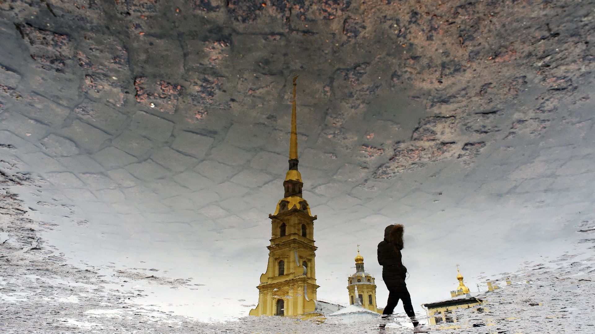 The silhouette of a woman reflected in a puddle as she crosses in front of the Peter and Paul Cathedral in Saint Petersburg. Photo: Olga Maltseva/AFP/Getty Images