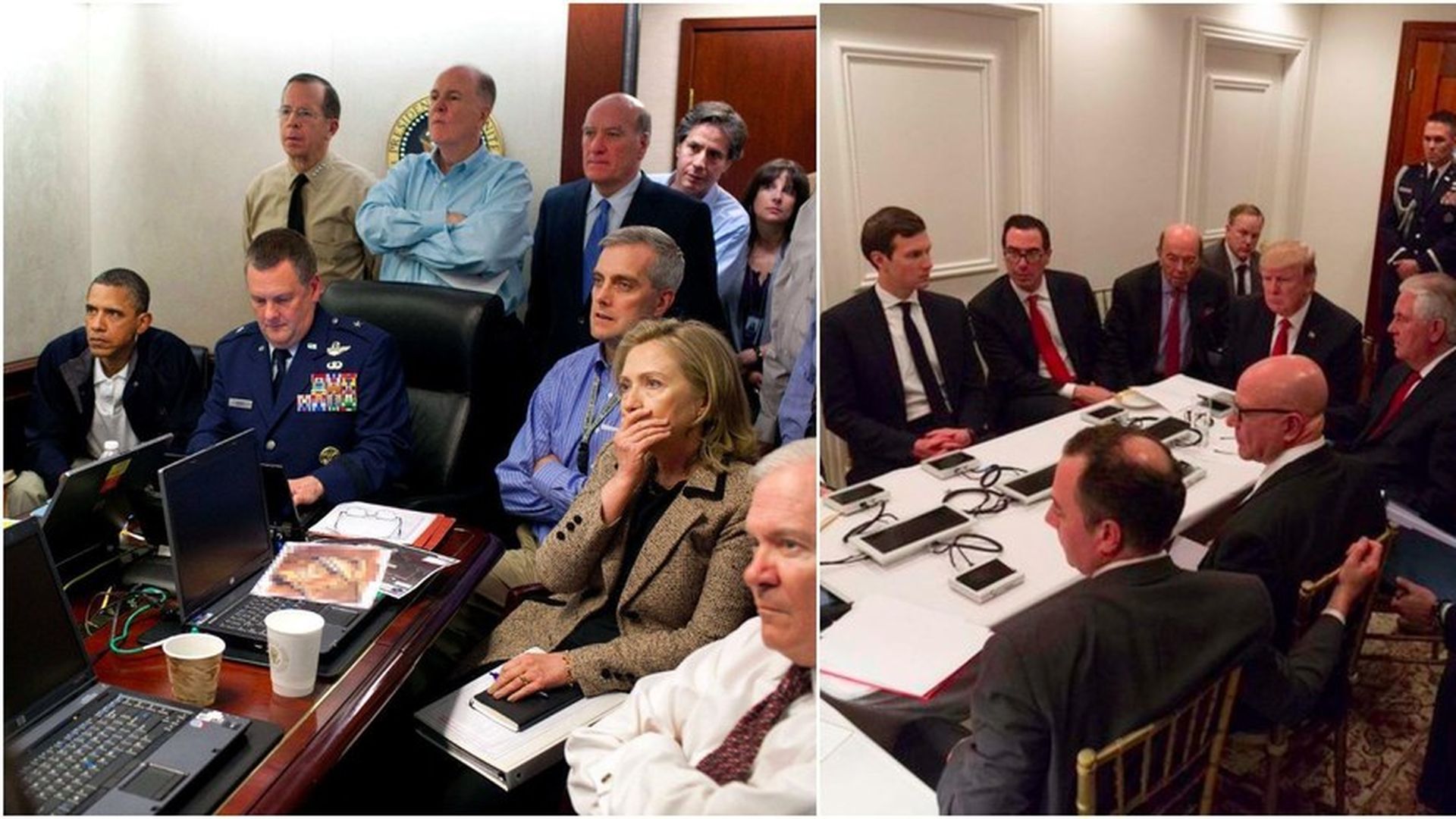 Sean Spicer tweeted a photo of Trump getting briefed on Syria in Mar-a-Lago, and it looked eerily similar to the famous 2011 photo of Obama and his National Security team in the Situation Room during Osama Bin Laden's capture. Here are the two photos with the people's names and titles listed.