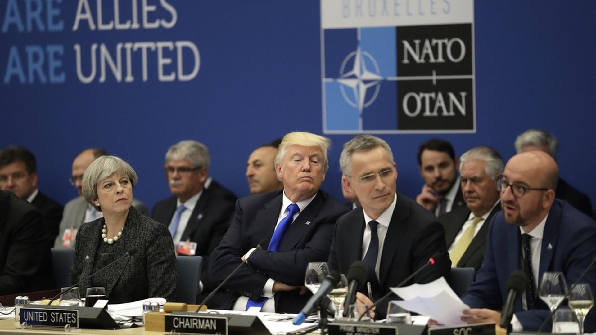 10:55am ET/ 4:55pm GMT+2: Trump participated in outdoor ceremony to mark the transfer of NATO's new headquarters building from the Belgian government to NATO. Trump was seated in the front now, next to Belgian King Philippe, NATO Secretary General Jens Stoltenberg, and Prime Minister Theresa May (who he leaned over to speak with several times).