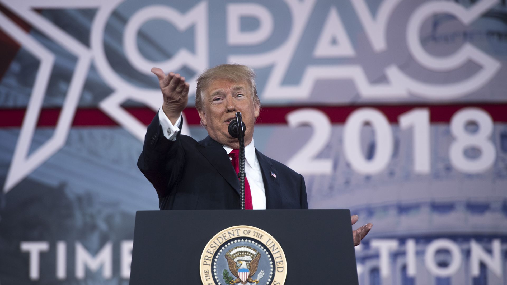President Trump took full advantage of a boisterous, supportive crowd during his morning speech at CPAC. He chose to return to his campaign trail rhetoric — including a full reading of his favorite immigration allegory, "The Snake" — and prompted the room to break into familiar chants of "lock her up!" and "build the wall!" He clearly relished the environment, asking the crowd at one point if he could "go off script a bit" because the text in his teleprompter was "boring."