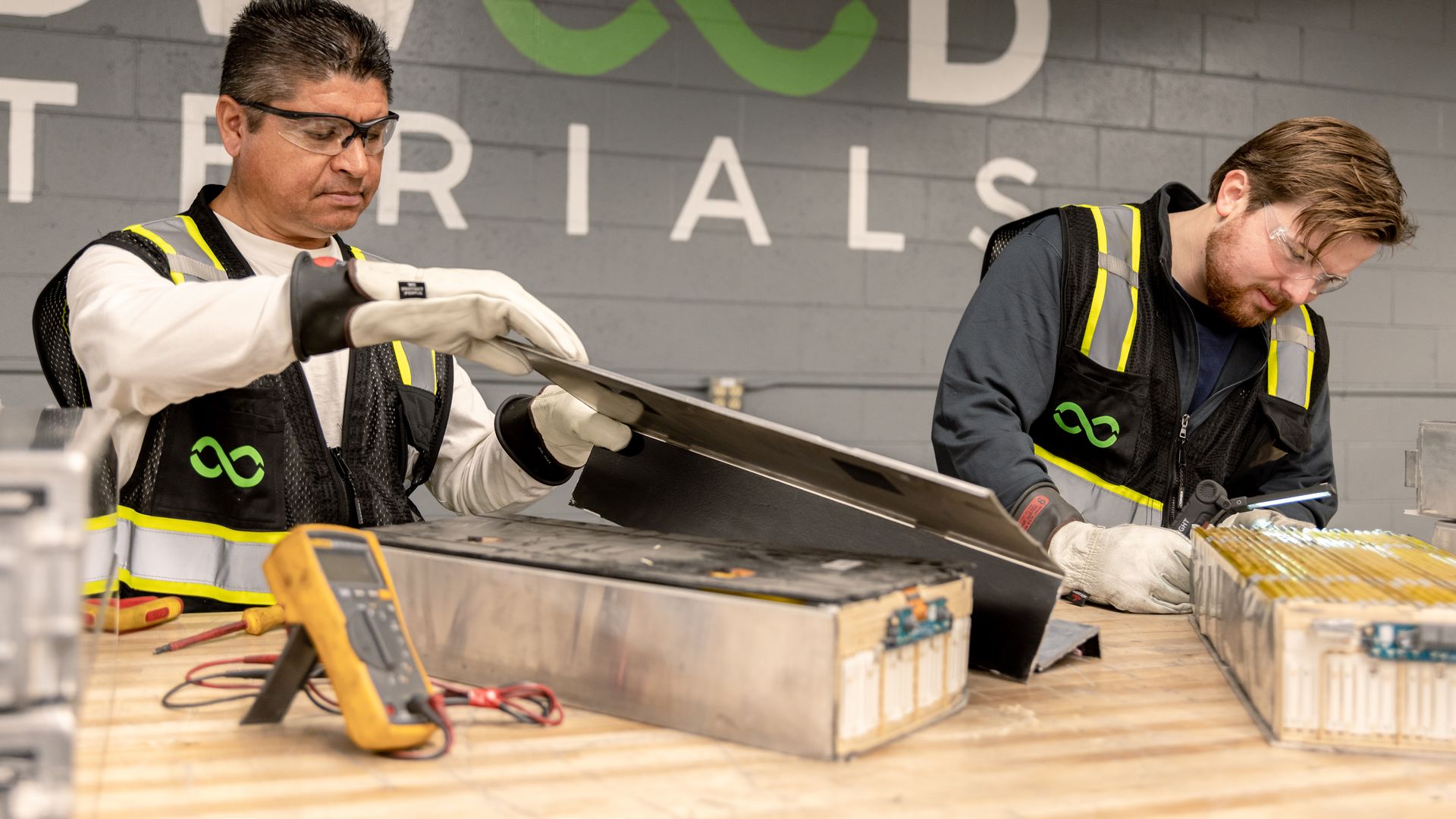 Redwood Materials workers breaking down battery modules. Photo: Courtesy of Redwood Materials.