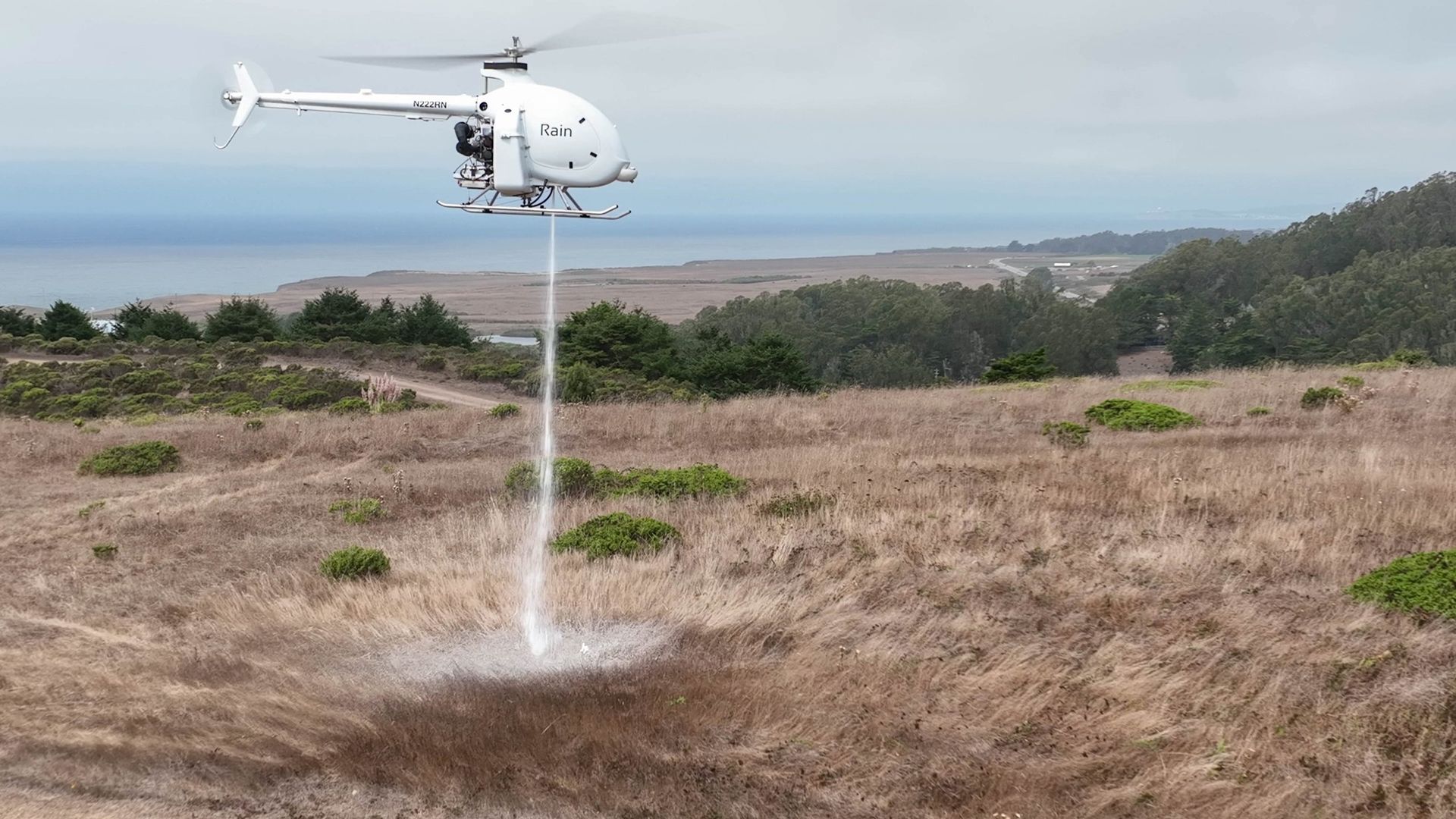 A Rain autonomous aircraft tests out fire-retardant spray. Photo: Courtesy of Rain.