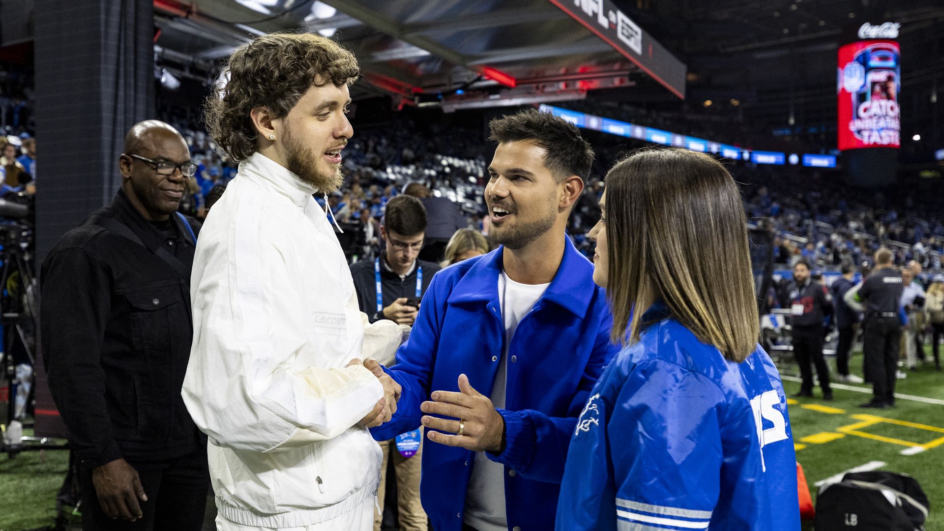 Jack Harlow talks to Taylor Lautner and his wife, also Taylor Lautner, before a Detroit Lions game in October. Photo: Lauren Leigh Bacho/Getty Images