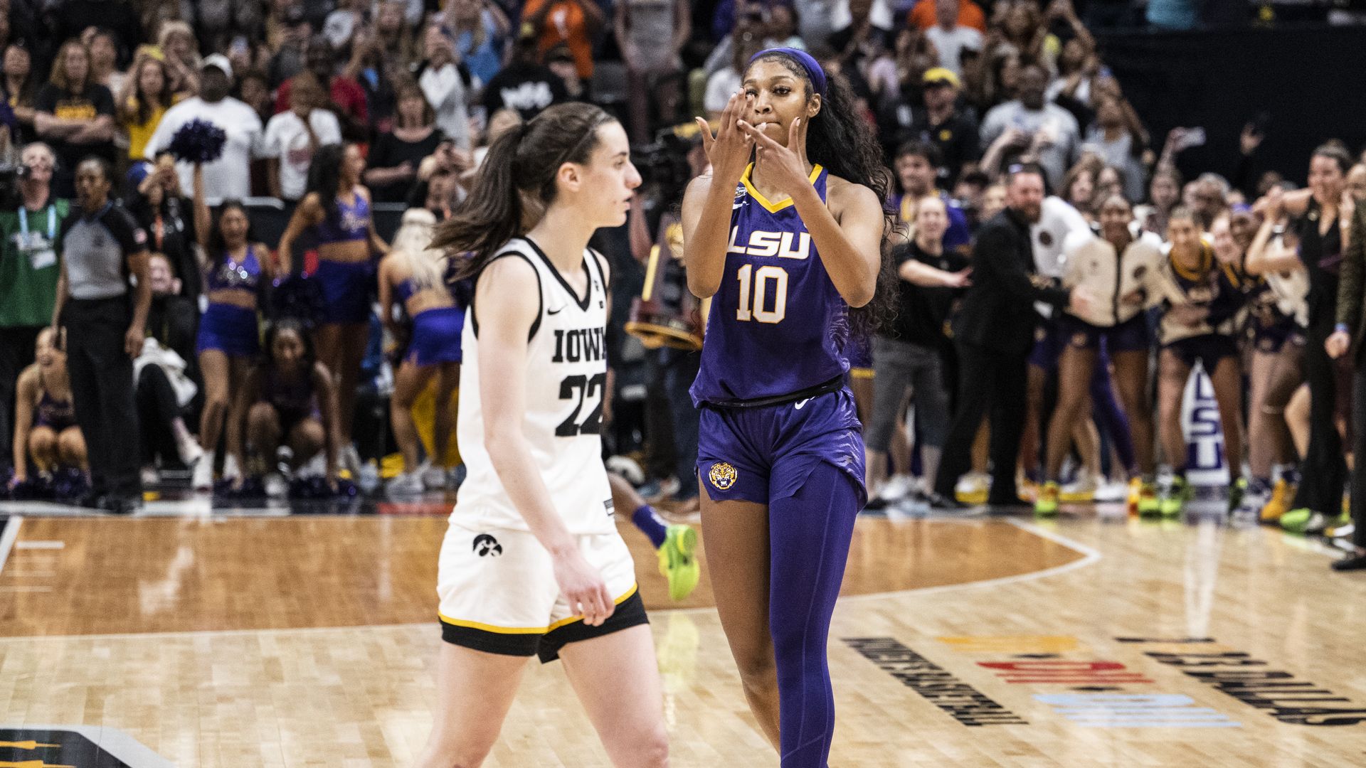 Angel Reese (right) and Caitlin Clark from the 2023 women's basketball championship game. Photo: Ben Solomon/NCAA Photos via Getty Images