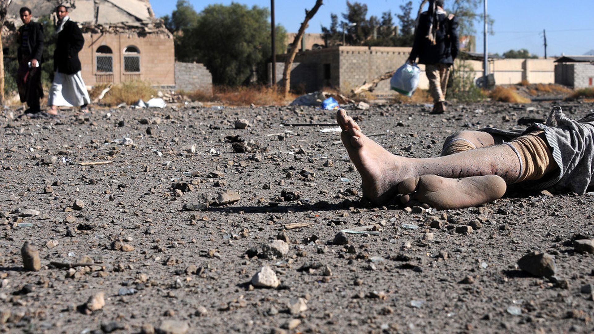 People walk near a body of a prisoner after he was killed in airstrikes targeted the prison on December 13, 2017 in Sana'a, Yemen. Photo: Mohammed Hamoud / Getty Images)
