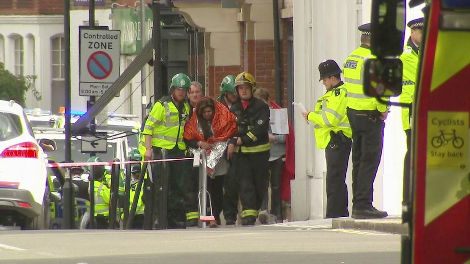 Photos from the scene: Fire raises at a southwest London subway station in London.Photo: @RRIGS via AP An ambulance leaves a cordon after an incident on a tube train at Parsons Green subway station in London.Photo: Frank Augstein / AP An armed police officer stands nearby after the incident.Photo: Frank Augstein / AP