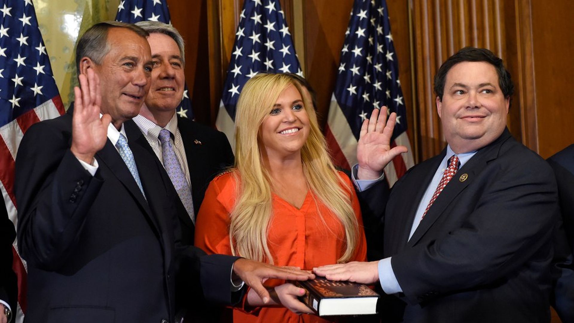 Former House Speaker John Boehner poses with Rep. Blake Farenthold, right, accompanied by family, to re-enact the House oath-of-office. Photo: Susan Walsh / AP