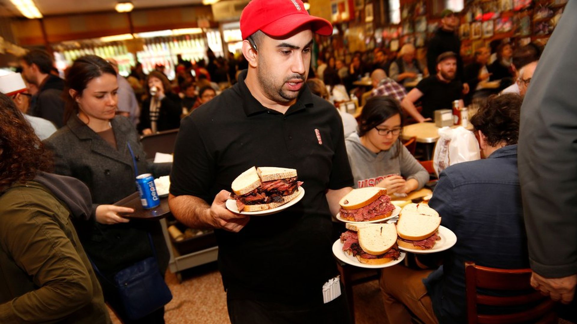 A waiter carries orders at Katz's Delicatessen in New York. Photo: Seth Wenig / AP
