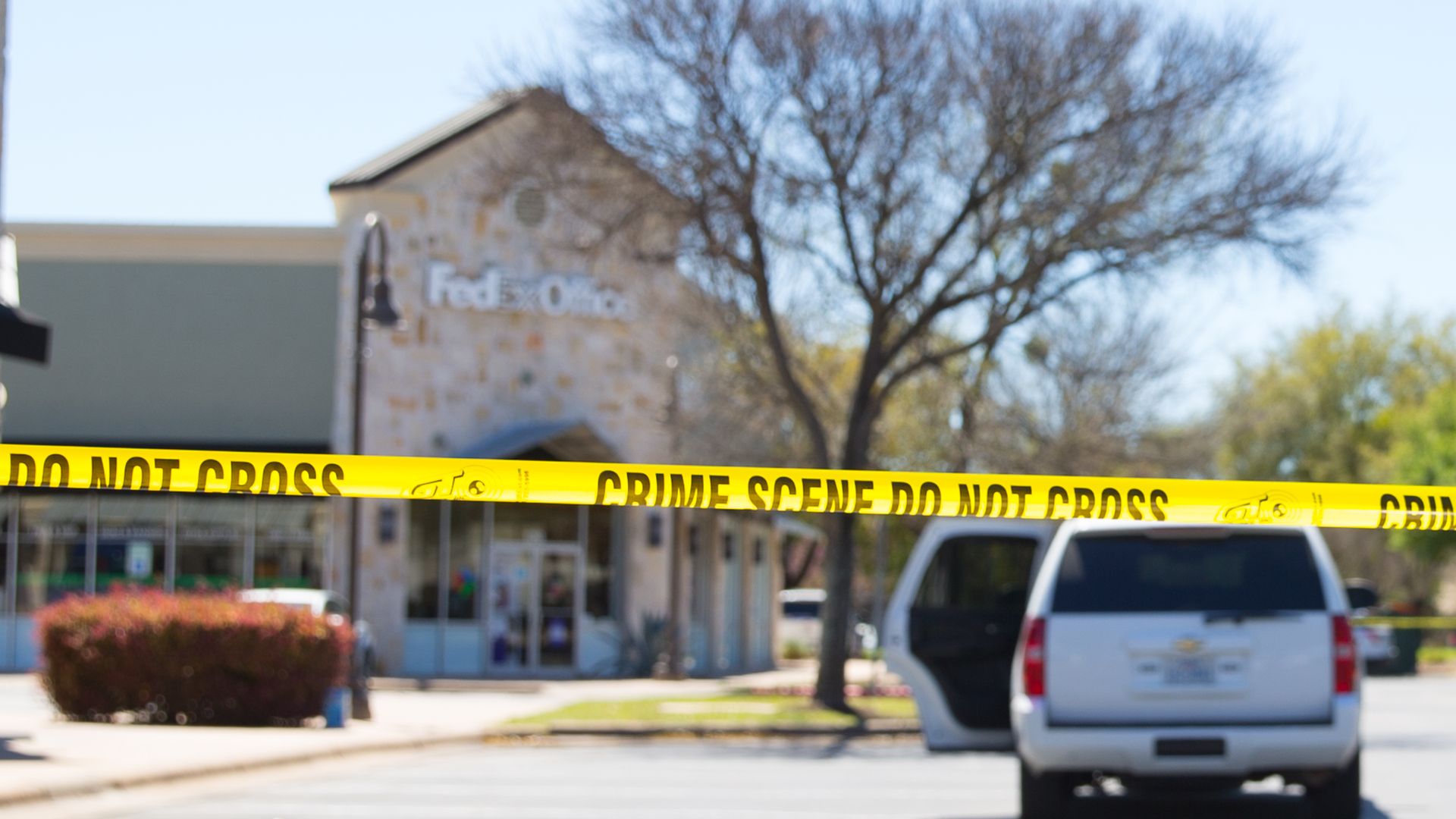 Police and FBI Agents investigate at the Sunset Valley FedEx store in Austin, Texas, which is linked to the package bomb.