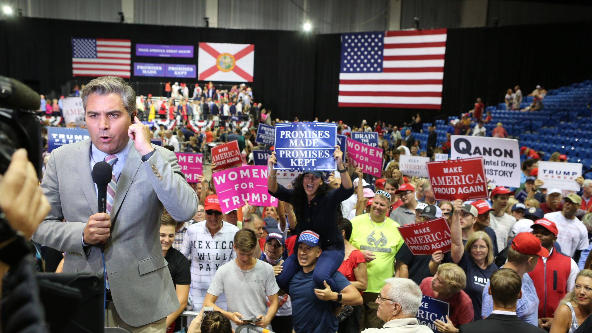 People at a Trump rally yelling, holding a sign that says "CNN SUCKS"
