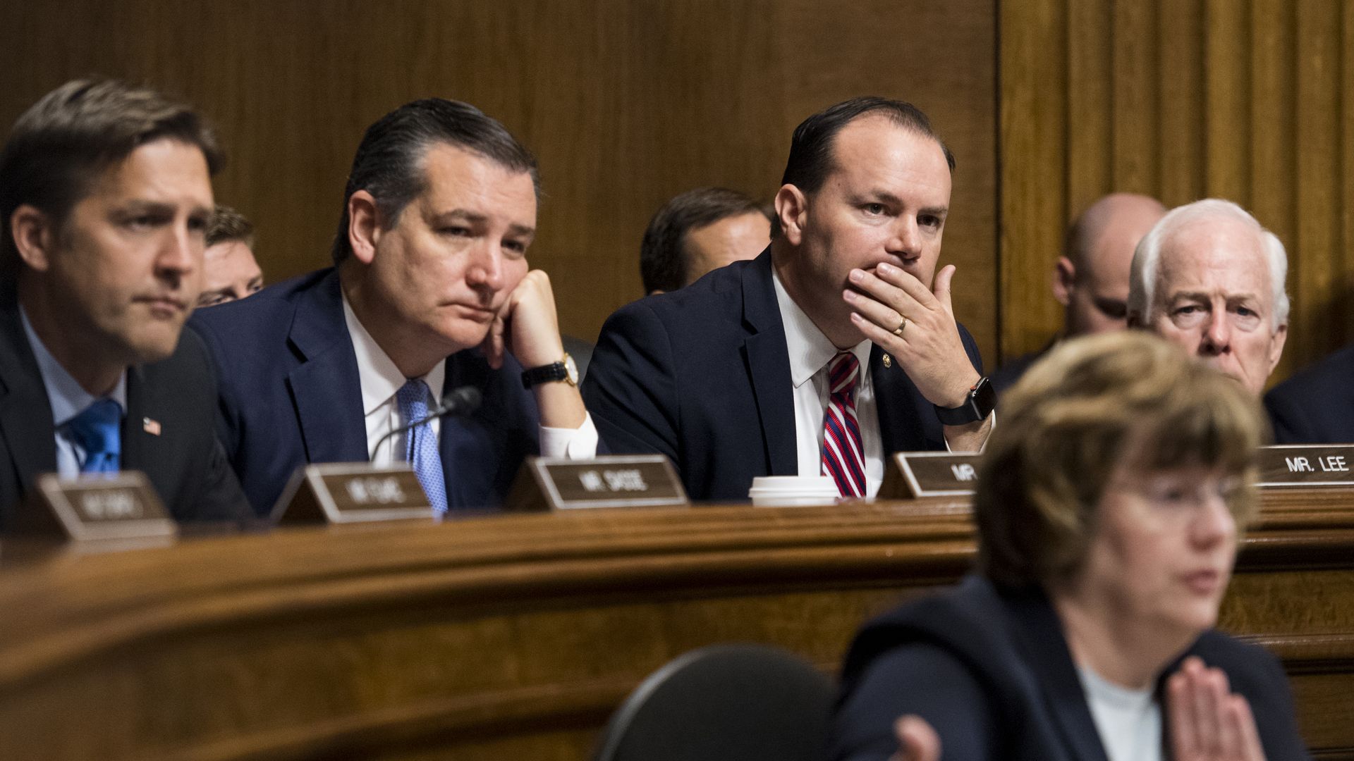Senate Judiciary Committee members (L-R) Sen. Mike Crapo (R-ID), Sen. Jeff Flake (R-AZ) (L) and Sen. Ben Sasse (R-NE)