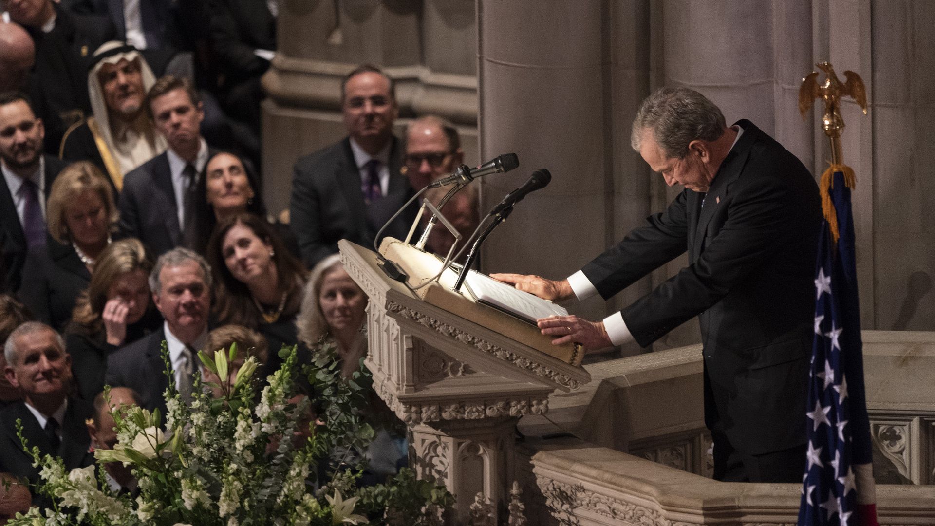 Former presidents sitting in the front row of George H.W. Bush's funeral.