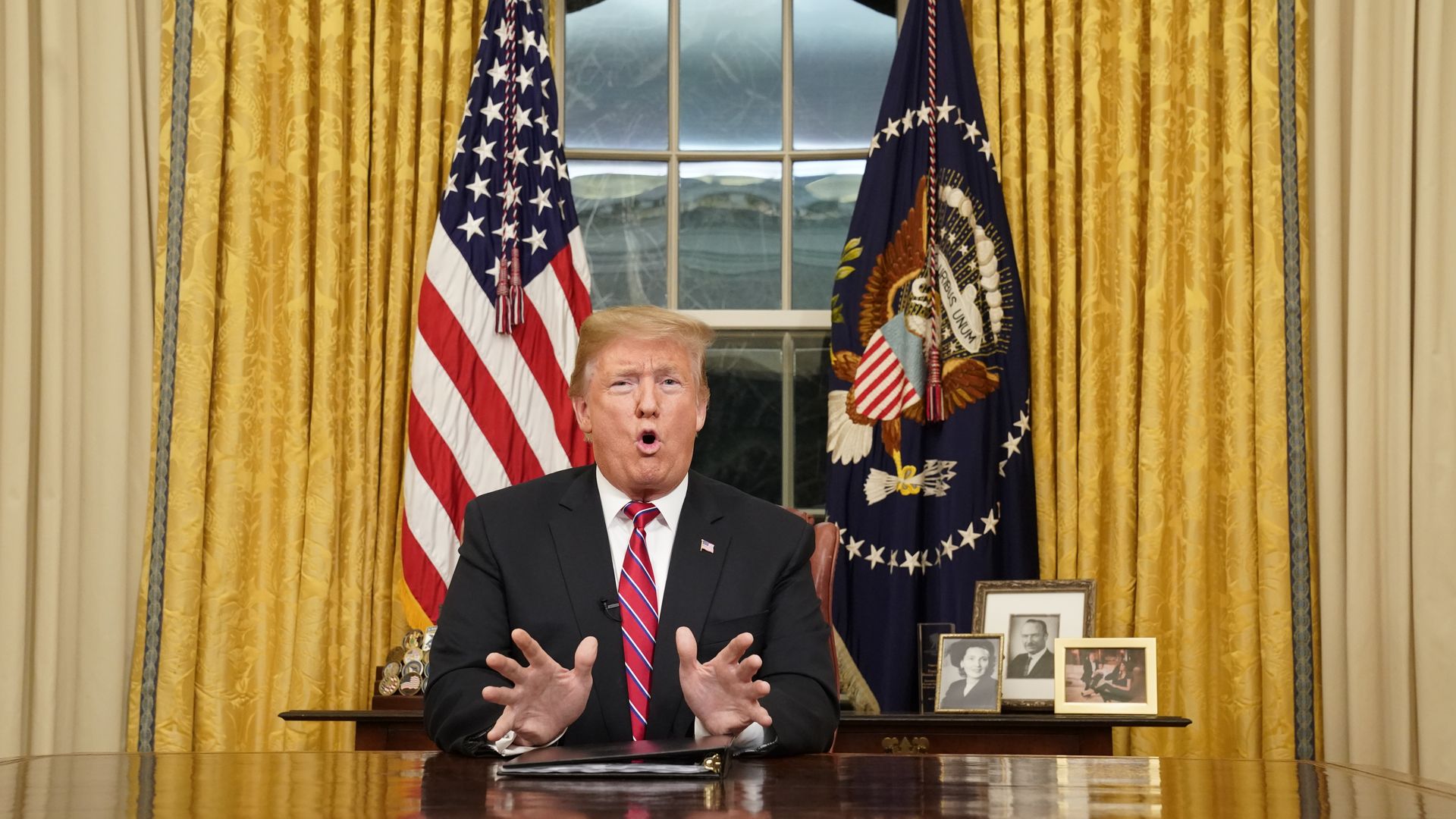 Donald Trump sitting in the Oval Office for his national address