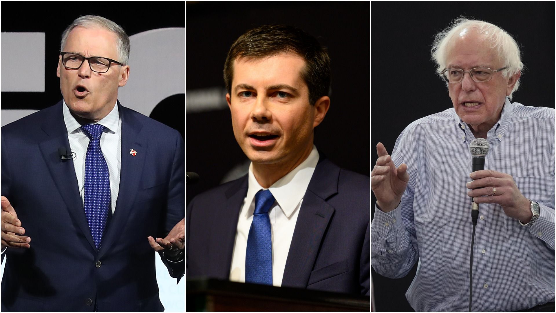 This image is a four-way split screen of Democratic candidates in this order, from left to right: Inslee, Gillibrand, Buttigieg, and Warren.
