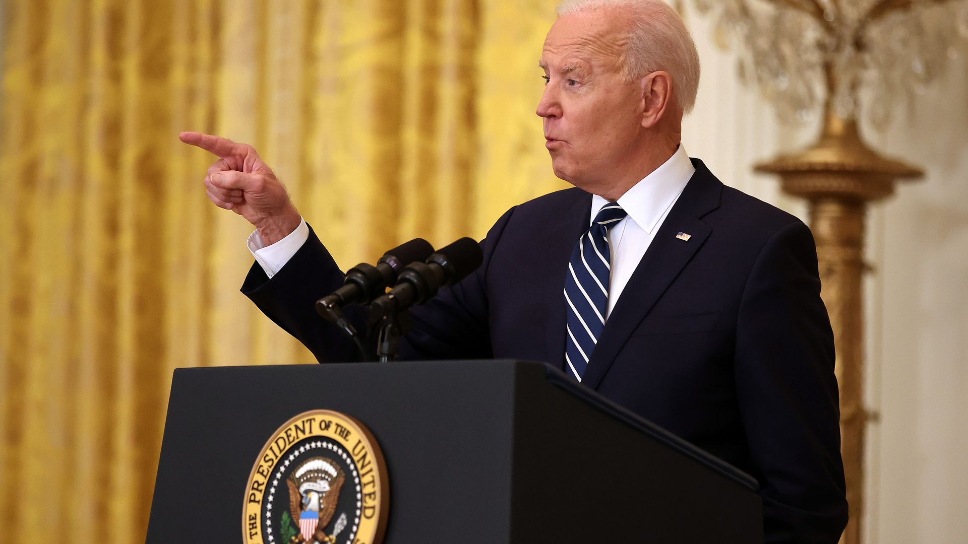 President Biden speaks at a podium with the presidential seal and flags in the background