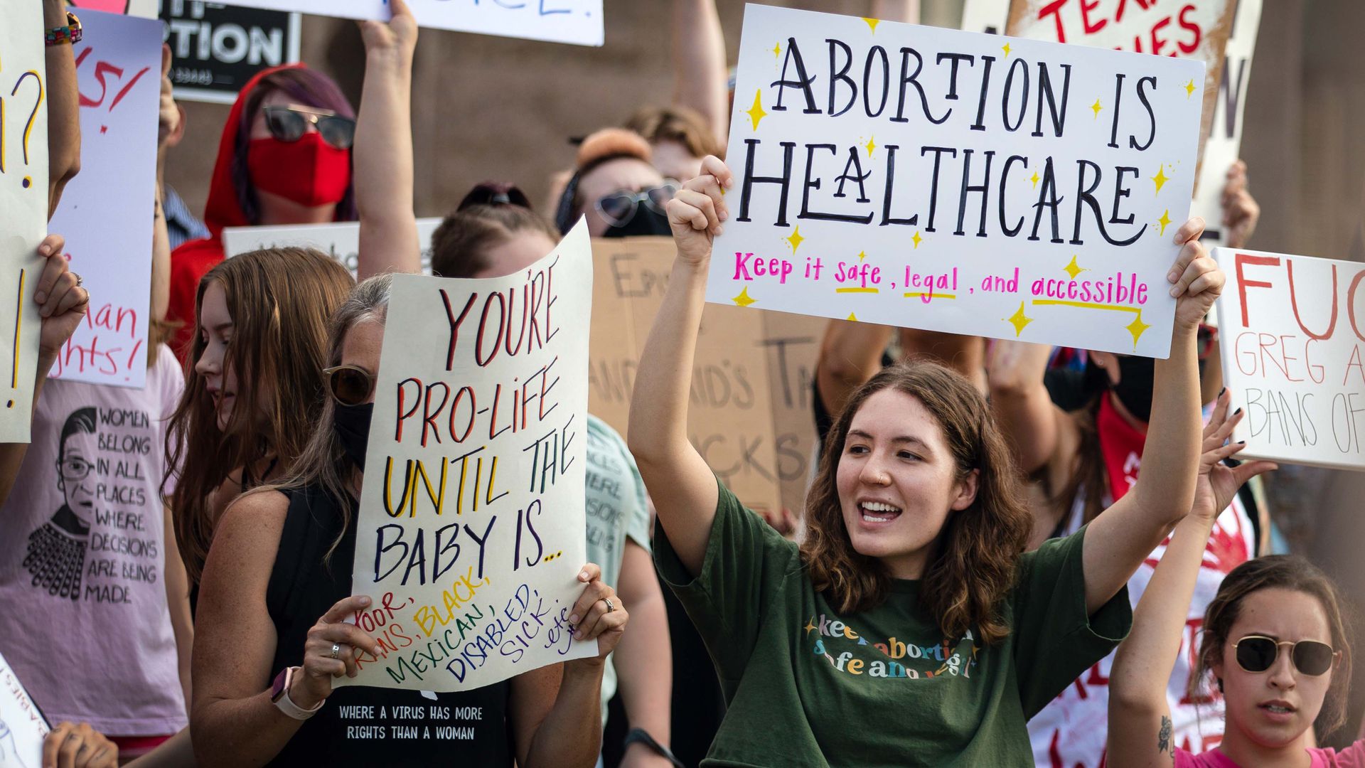Demonstrators rally against anti-abortion and voter suppression laws at the Texas State Capitol on October 2, 2021 in Austin, Texas.