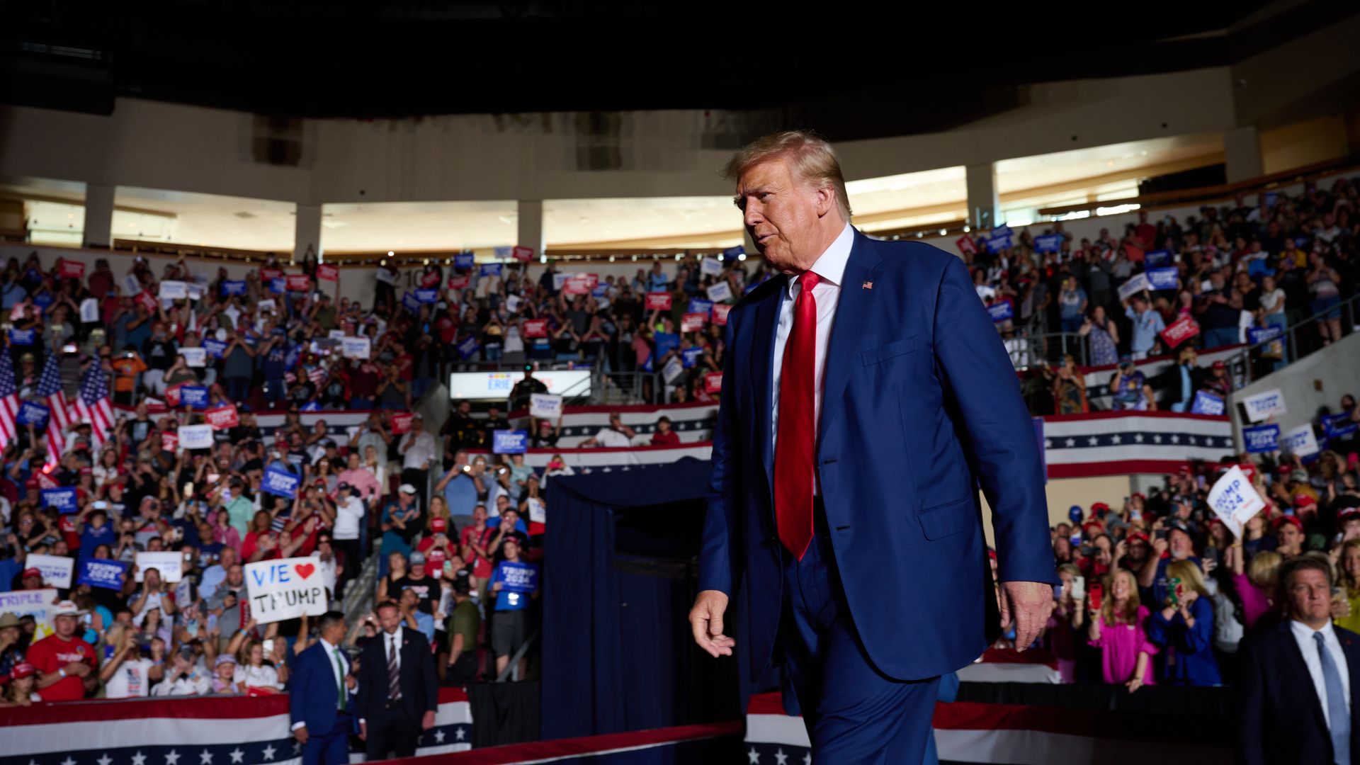 ormer U.S. President Donald Trump speaks to supporters during a political rally while campaigning for the GOP nomination in the 2024 election at Erie Insurance Arena on July 29, 2023 in Erie, Pennsylvania.