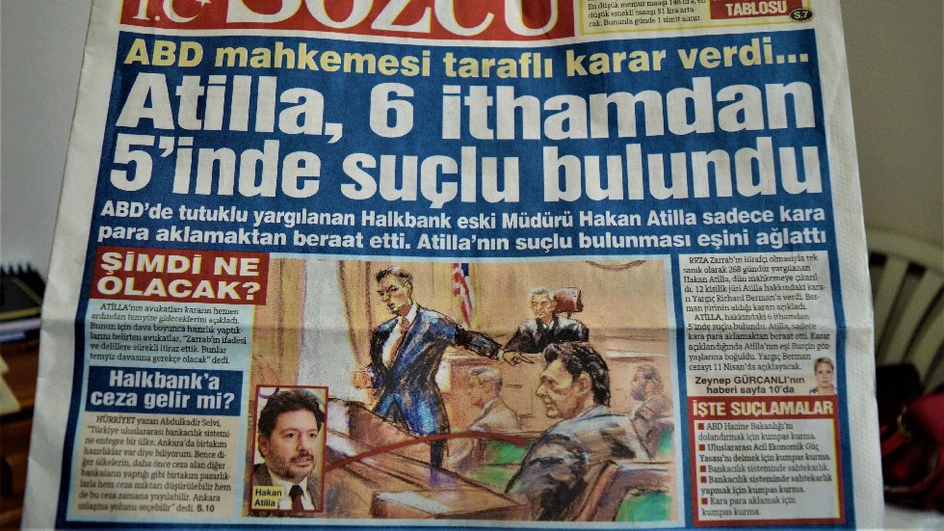 The front page of an Ankara newspaper showing Atilla in the courtroom. Photo: Altan Gocher / NurPhoto via Getty Images