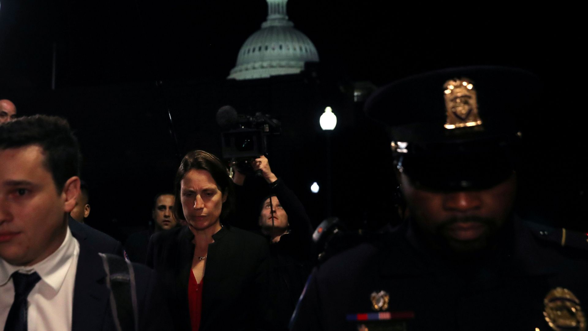 Fiona Hill leaves Capitol Hill last night after more than 9 hours of testimony. Photo: Leah Millis/Reuters