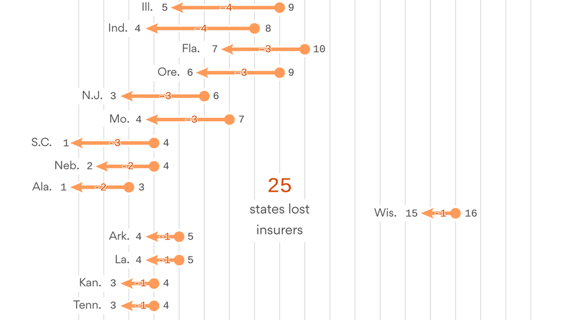 Republicans aren't wrong when they say Obamacare lost a lot of insurers last year. Here's a look at the biggest losers among the 39 states that use the federal marketplace, based on HHS data. It shows you the drop between 2016 and 2017. (Twelve states had no change, so they're not listed.) A few highlights: