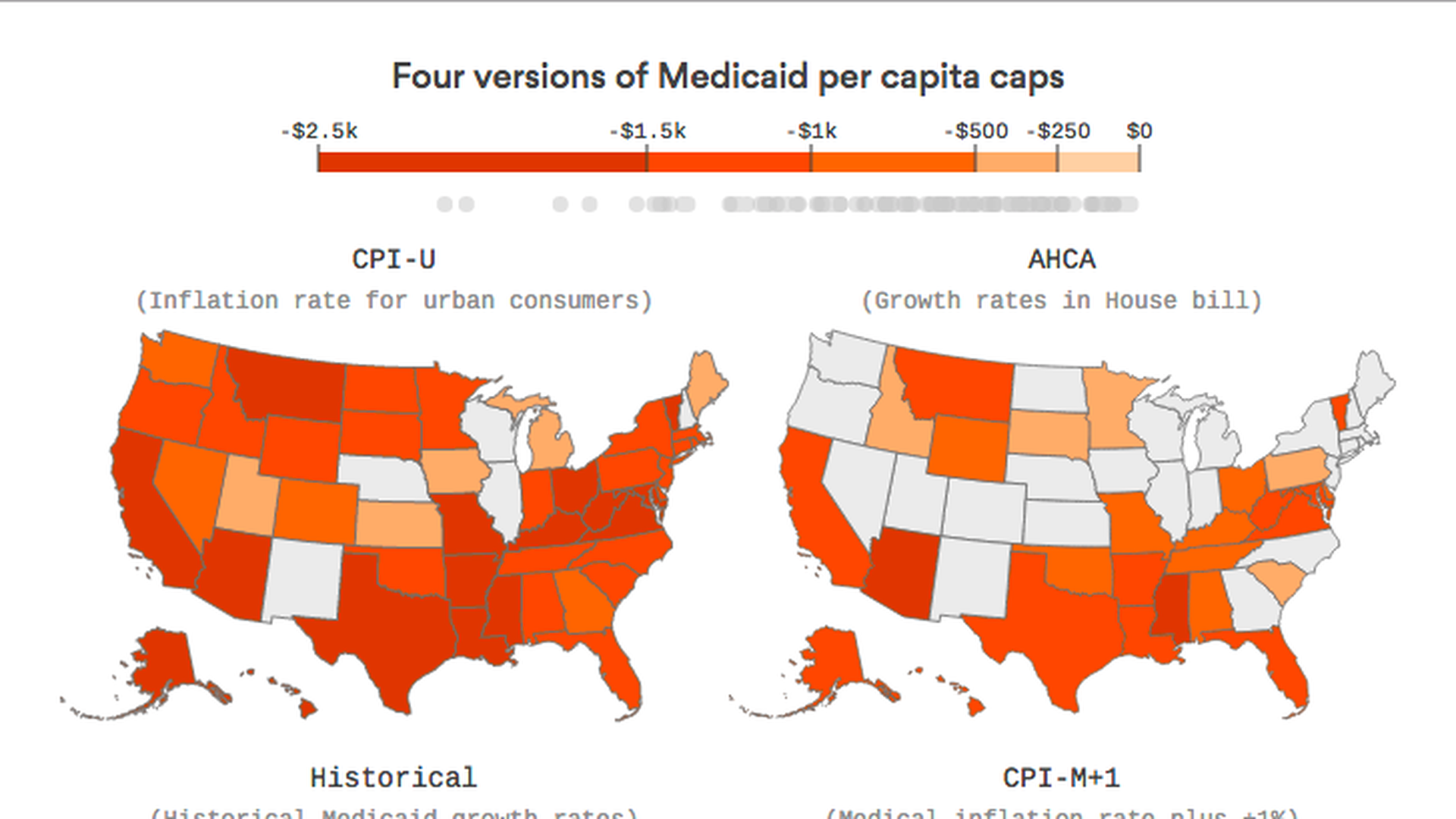 The maps compare what would happen if Medicaid per capita spending was limited to: