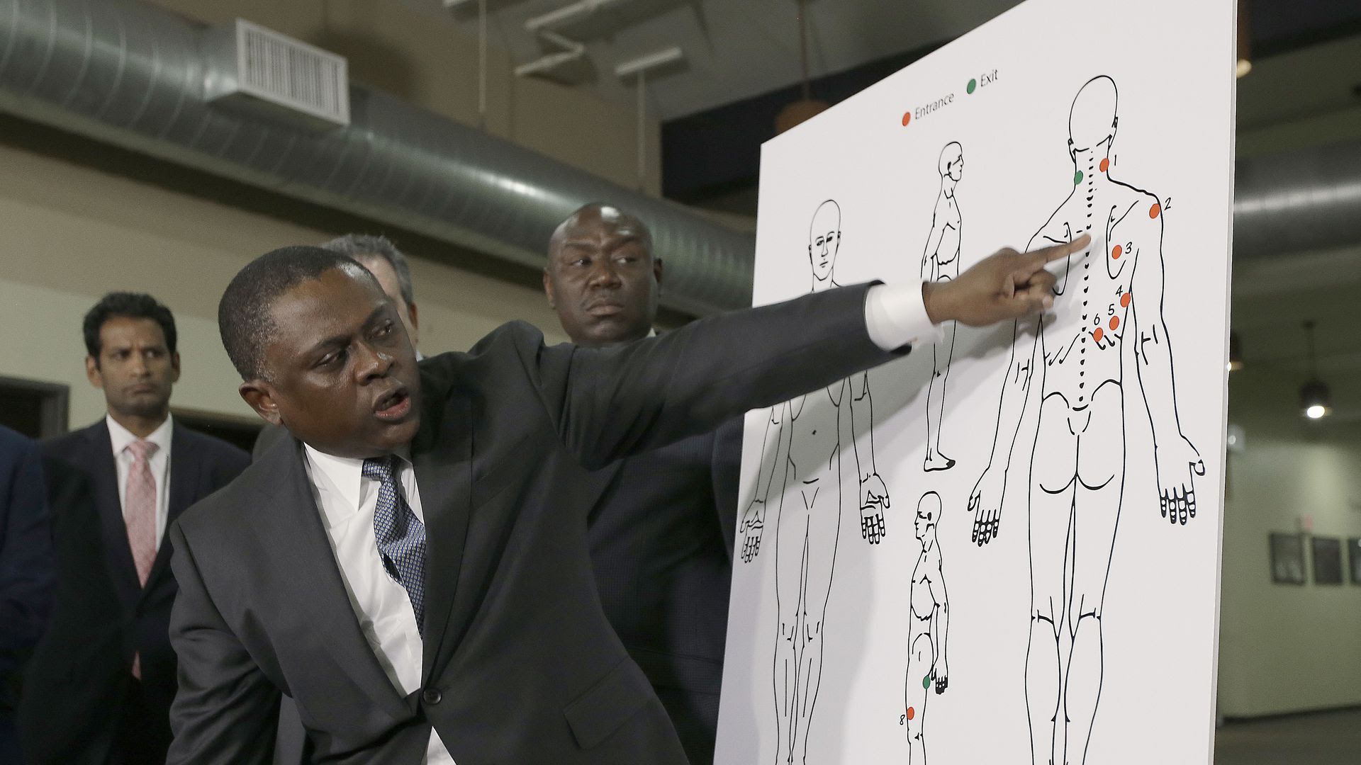 Dr. Bennet Omalu, a pathologist, shows where Stephon Clark was hit by bullets. Photo: Rich Pedroncelli