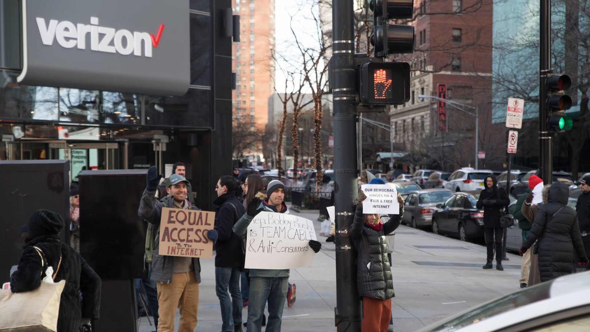 Net neutrality protests outside a Verizon store in Chicago. Photo: Patrick Gorski/NurPhoto via Getty Images
