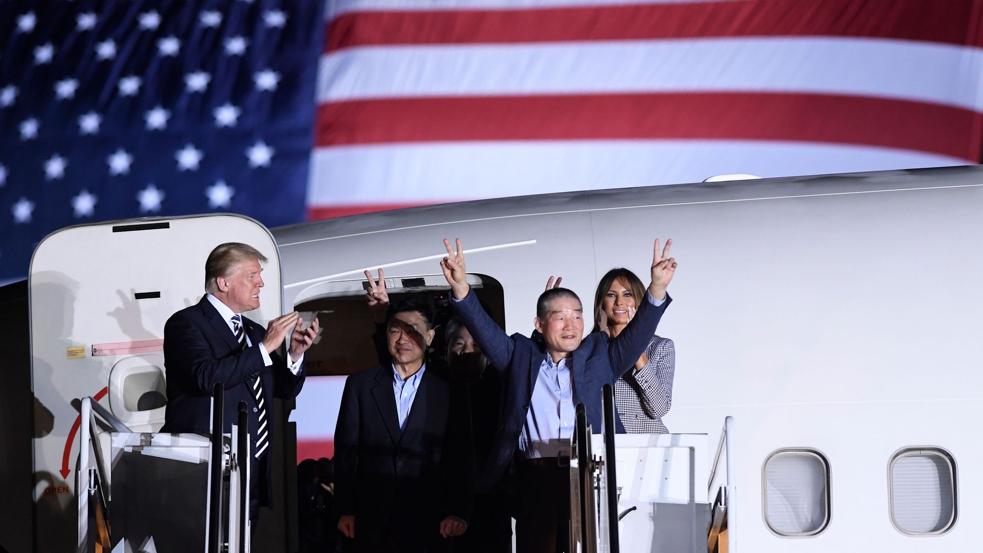 In the wee hours on live global television, President Trump greeted three American prisoners freed from North Korea as they landed at Andrews Air Force Base, Md., and engaged a returnee and his translator in brief banter.