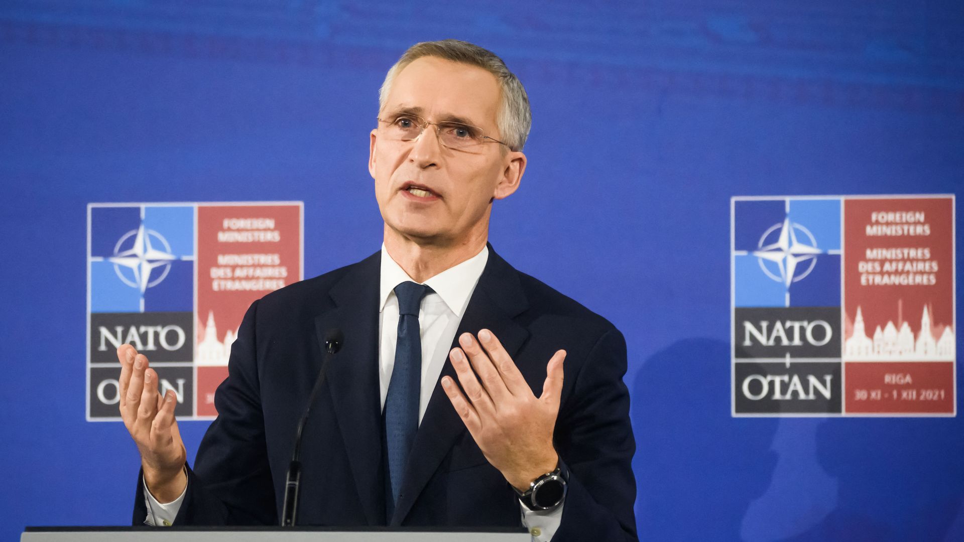 When asked Wednesday whether NATO was expanding toward Russia's "sphere of influence," Secretary-General Jens Stoltenberg gave an impassioned response, pounding his podium and insisting that it's "not acceptable" for the Kremlin to control the actions of its sovereign neighbors.